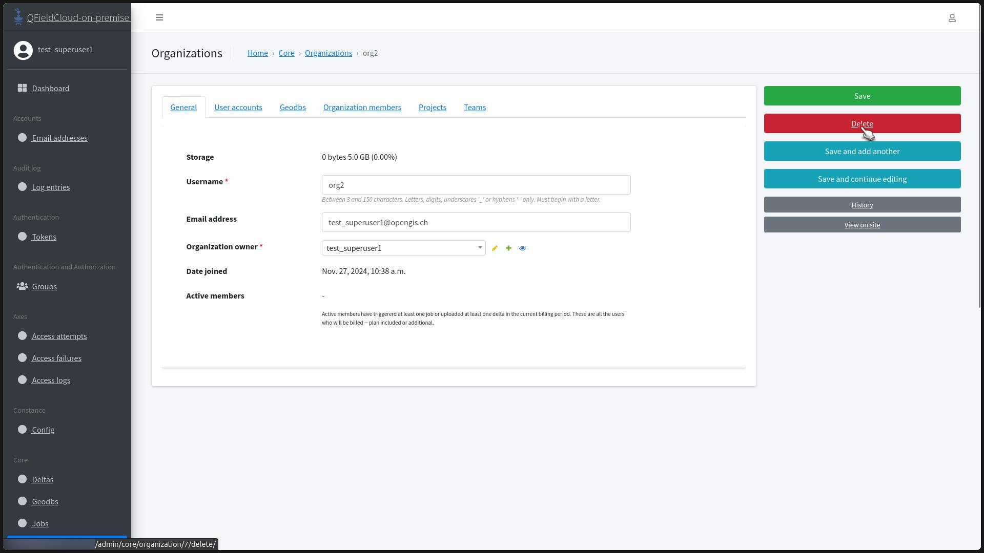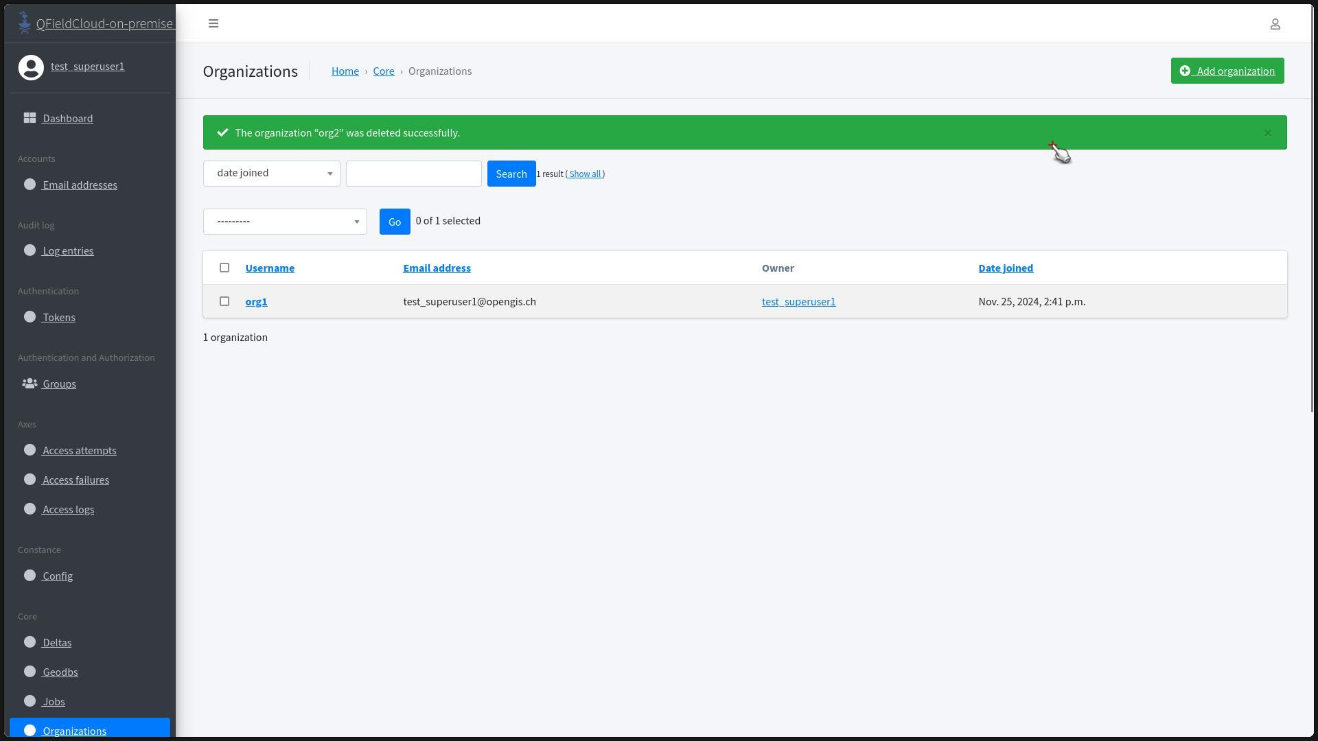 5.You will be redirected to the "Organization" Section and a message should appear at the top of the page indicating the successful deletion.