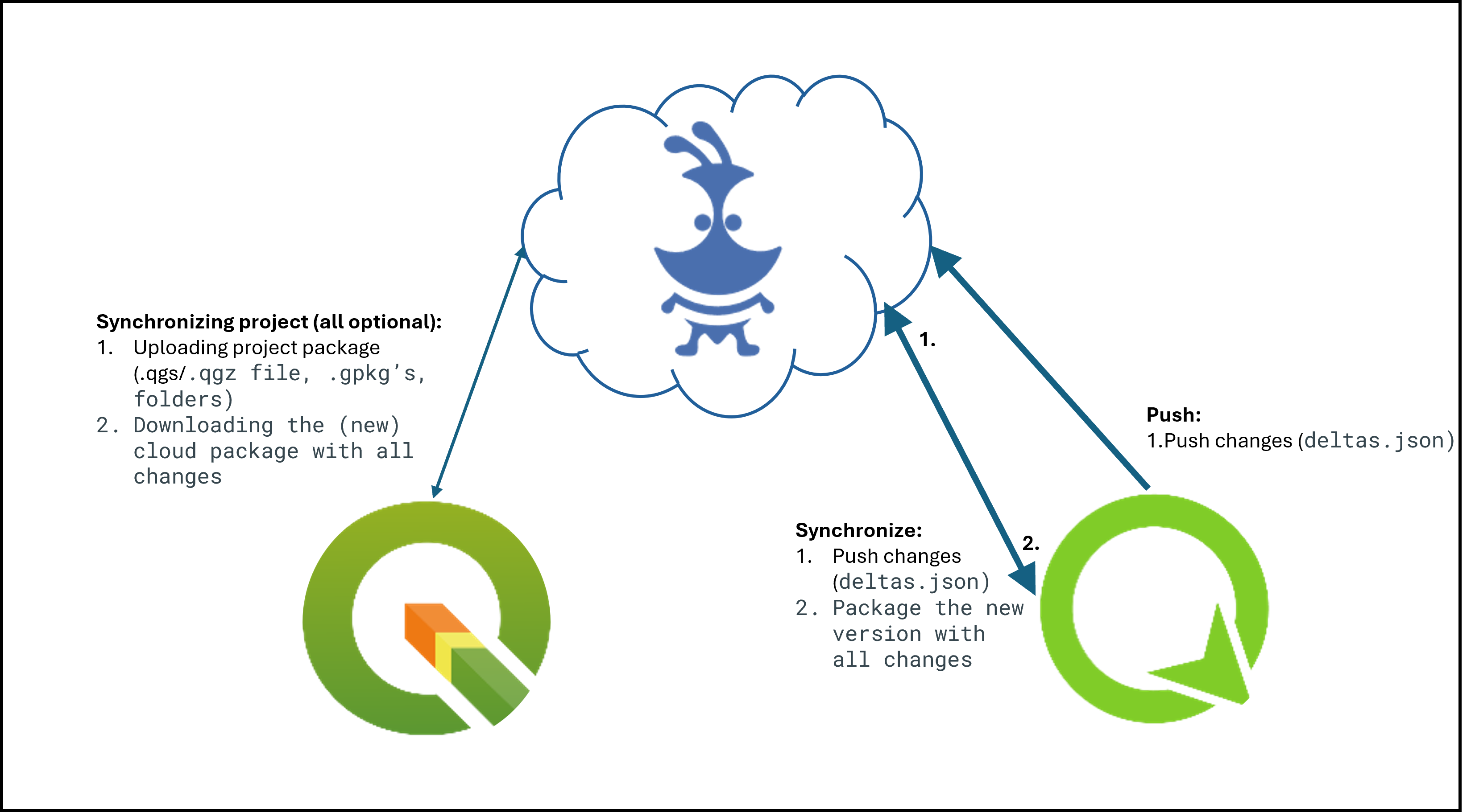 - From QGIS to QFieldCloud: This synchronization process uploads a complete new "project package" and replaces the existing one stored in the cloud. If you are working with GeoPackages it is important to note, that the existing GeoPackage on the cloud will be replaced with the one you have just uploaded.