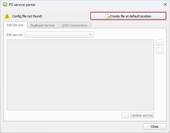 If you never set-up a service file before, the plugin will automatically create a new file in a proper default directory, which ensures QGIS will be able to read it.
