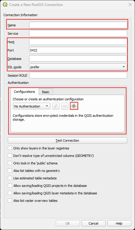 - Direct Connection: When connecting to a PostgreSQL database, you can store all information including the credentials inside the QGIS Project directly.