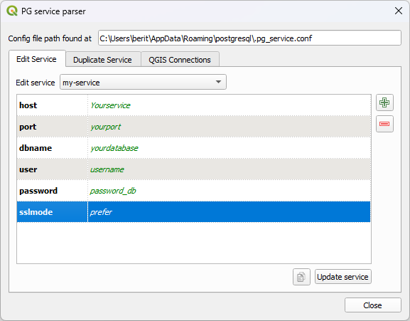There exists a useful plugin, which supports in the easy creation and configuration of the service file - the PG Service Parser Plugin. We recommend using this plugin and will show you below how to use it.