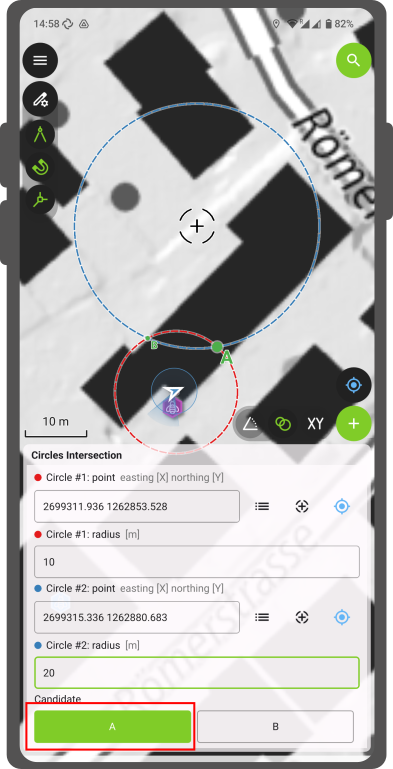 7. Once you set the center points and the radio, virtual circles will be drawn on the map, and the two points where the circles intersect will be labelled as "A" and "B".